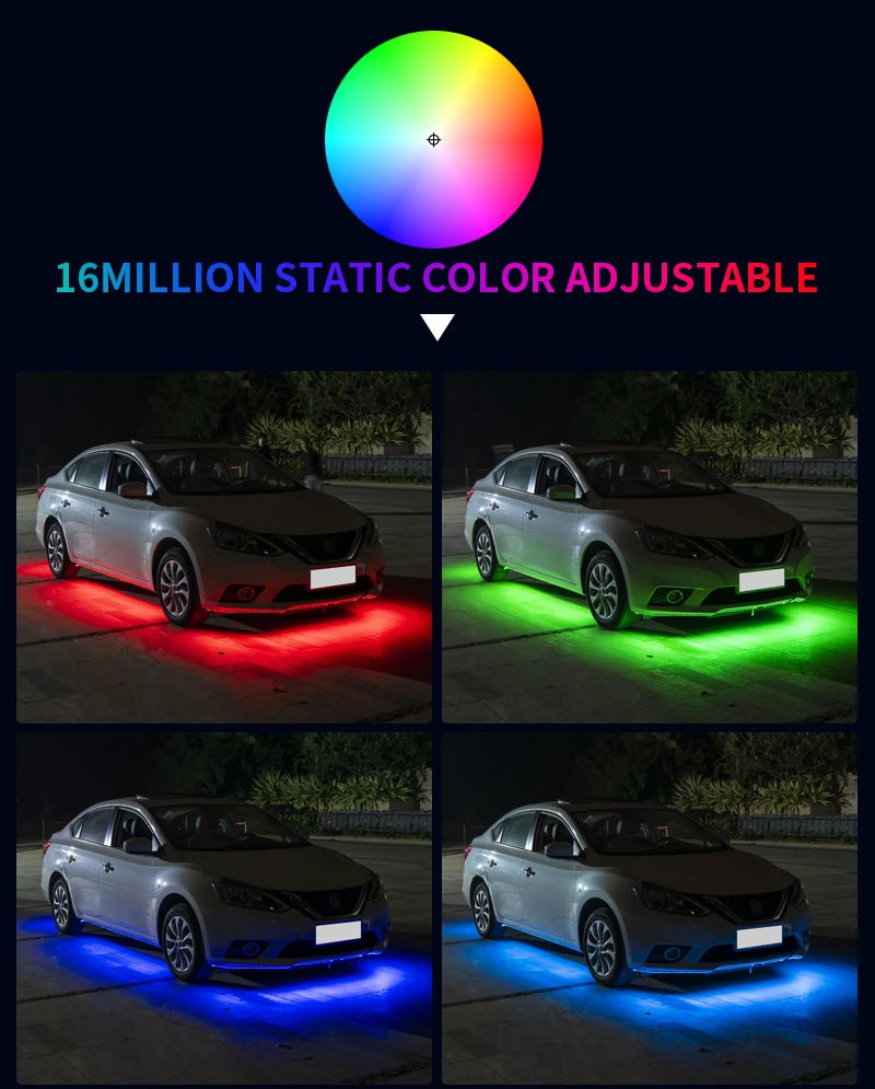 MULTI COLORS- The LED under car glow system produces multi colors which are Blue, Green, Purple, Red, Teal, White, and Yellow. The under car glow system has also fifteen(15) color flashing modes, perfect for synchronizing with the beat of music.