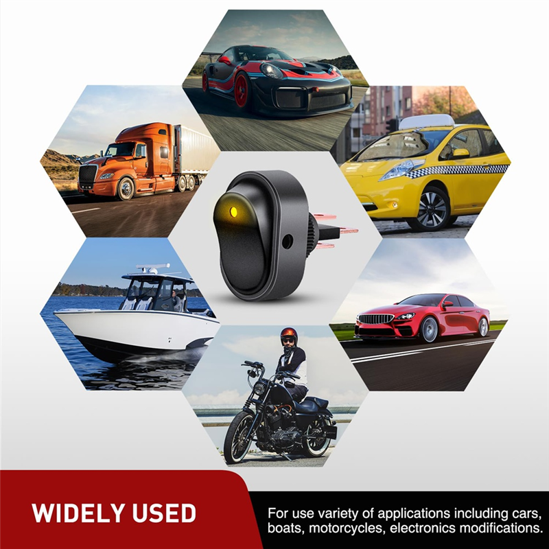 Widely Used: The 12v rocker switch mainly be used in car, ATV, UTV, SUV, wrangler, RV, off road vehicle, truck, boat, yacht & electronics modification, etc. Available for upgrading most wiring harnesses to control LED light bar, LED work lights, fog lamps, headlights, taillights & auxiliary lamps, etc.
