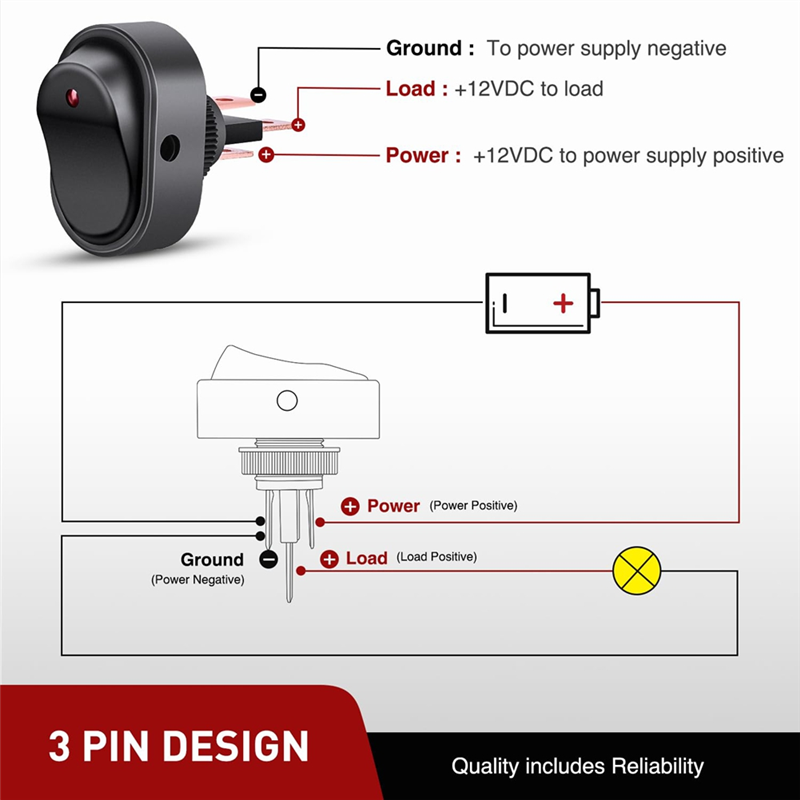 Perfect Design: Designed to connect and disconnect a DC 12V 30A electrical circuit at will, SPST:(single pole single throw), ON-OFF control; 2 pole design (On/Off), 3rd poles with LED to be connected to earth. LED on the switch will illuminate when the switch is turned on.